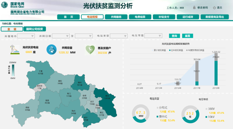 依托外部数据和企业内部数据“双驱动”,立足于“第三方”视角,基于营销、财务等信息系统及外部天气相关数据,围绕光伏扶贫电站建设规模、服务质效、运行成效、行业发展趋势研判开展大数据分析,全面监测目前光伏扶贫电站建设规模,跟踪掌握扶贫项目推进情况以及近年来光伏扶贫电站发展趋势;及时发现光伏扶贫业务过程中的卡口问题,确保光伏扶贫用户补贴落到实处,提高公司优质服务水平;着眼于贫困户光伏扶贫收益及节能减排生态价值发挥,客观评估电站投产运营收益和效率水平。